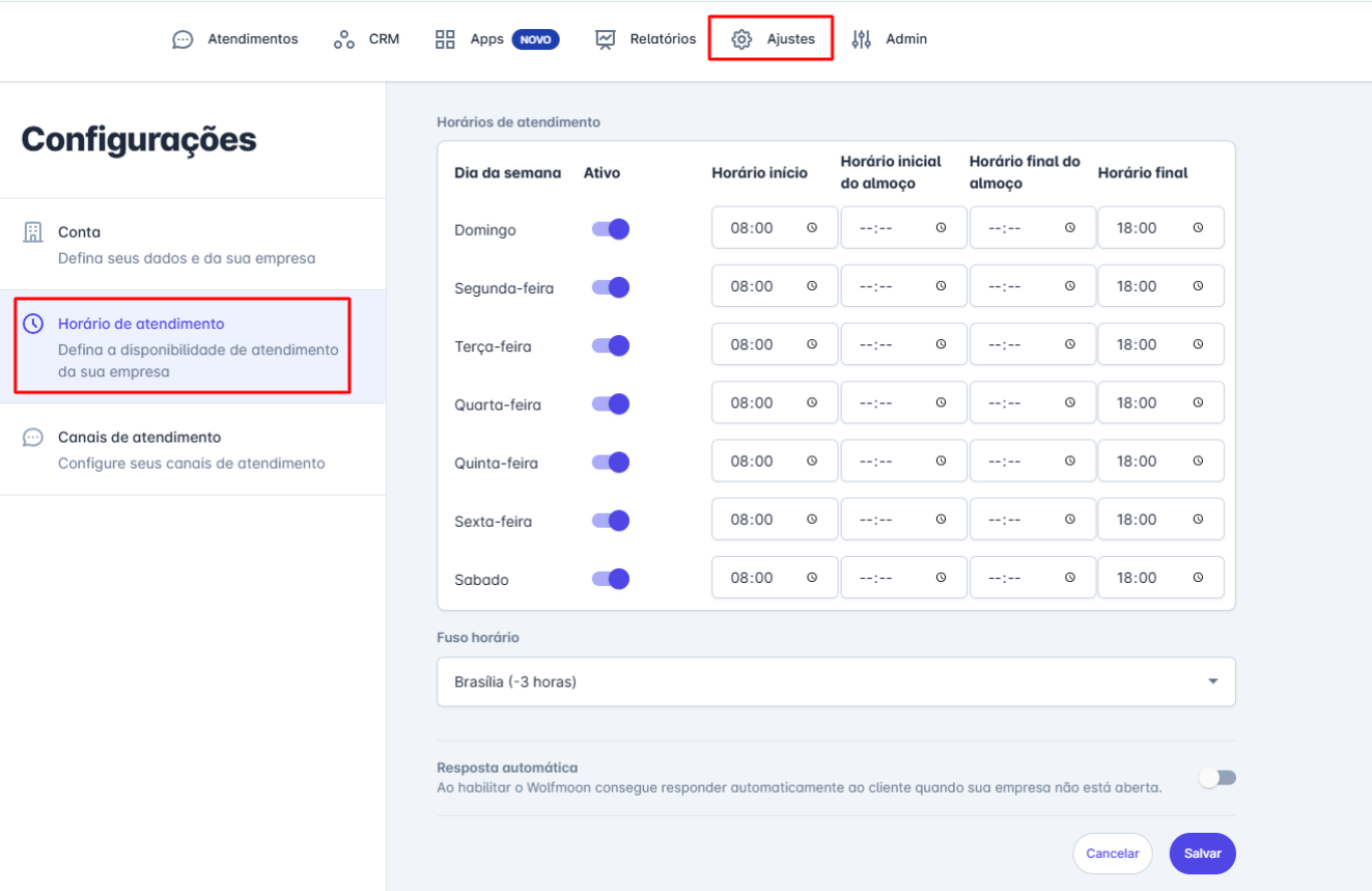 É possível optar pela resposta automática fora do horário de atendimento, para isso ligue a chave de resposta automática para ativar esta funcionalidade.