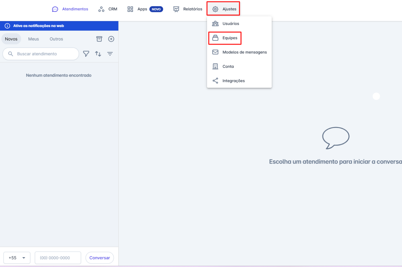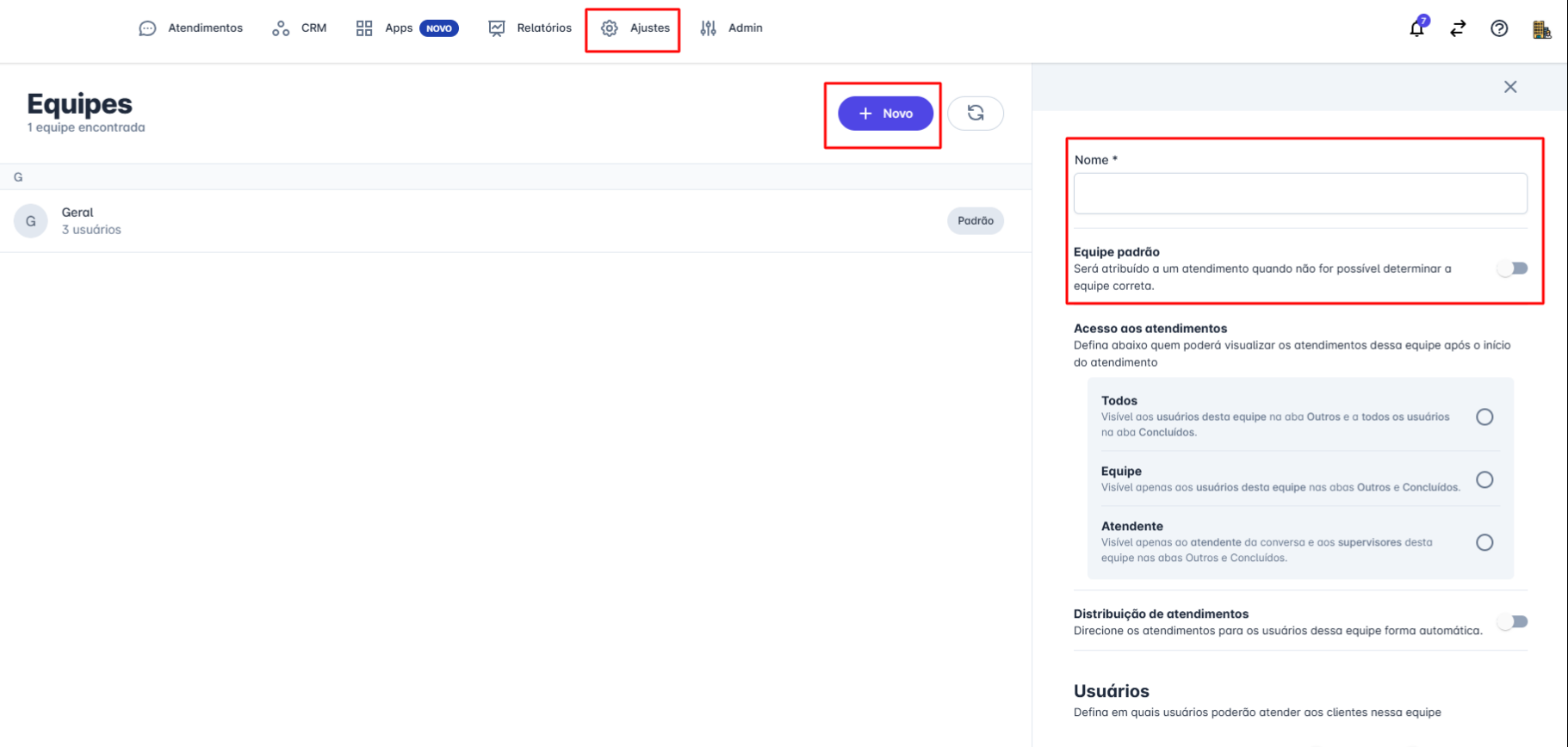 Passo 1: Acesse o menu "Ajustes" e clique em "Equipes", em seguida, selecione "+ Novo".