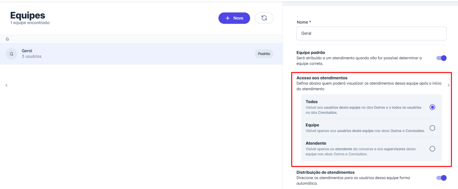 Ao configurar a **equipe de atendimento**, é possível definir **quem poderá visualizar os atendimentos** após o início da conversa. Essa configuração afeta onde os atendimentos aparecerão nas abas **"Outros"** e **"Concluídos"** dentro da plataforma.