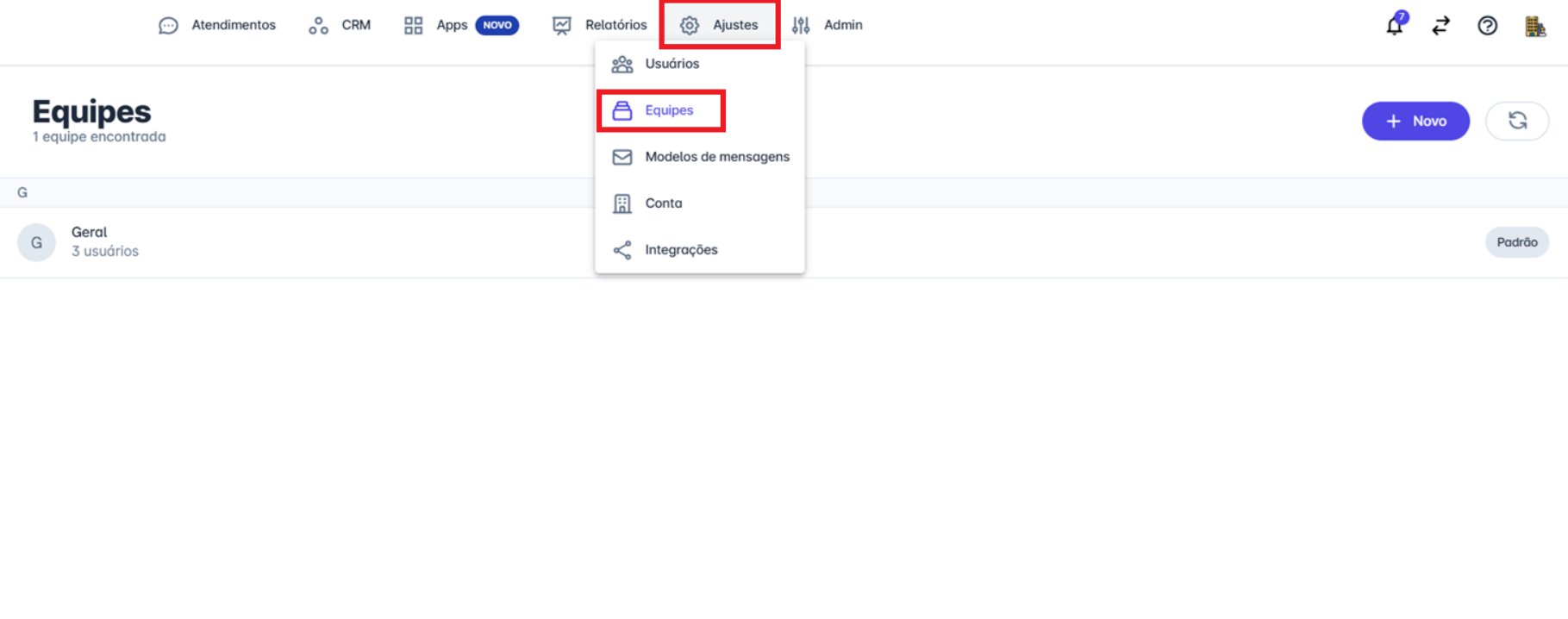 **Passo 1**: Para acessar essa configuração na plataforma, no menu principal clique em **Ajustes** em seguida **Equipes**.