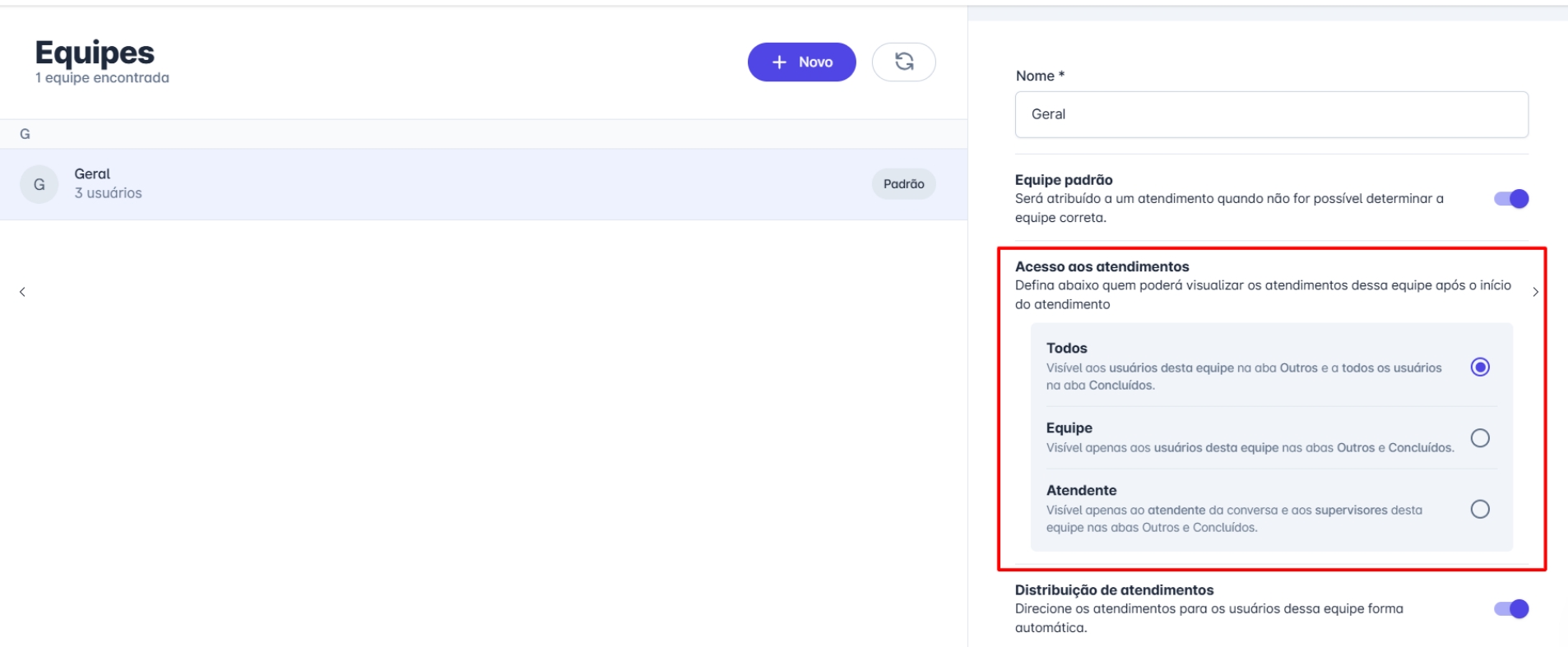 Ao configurar a equipe de atendimento, é possível definir quem poderá visualizar os atendimentos após o início da conversa. Essa configuração afeta onde os atendimentos aparecerão nas abas "Outros" e "Concluídos" dentro da plataforma.