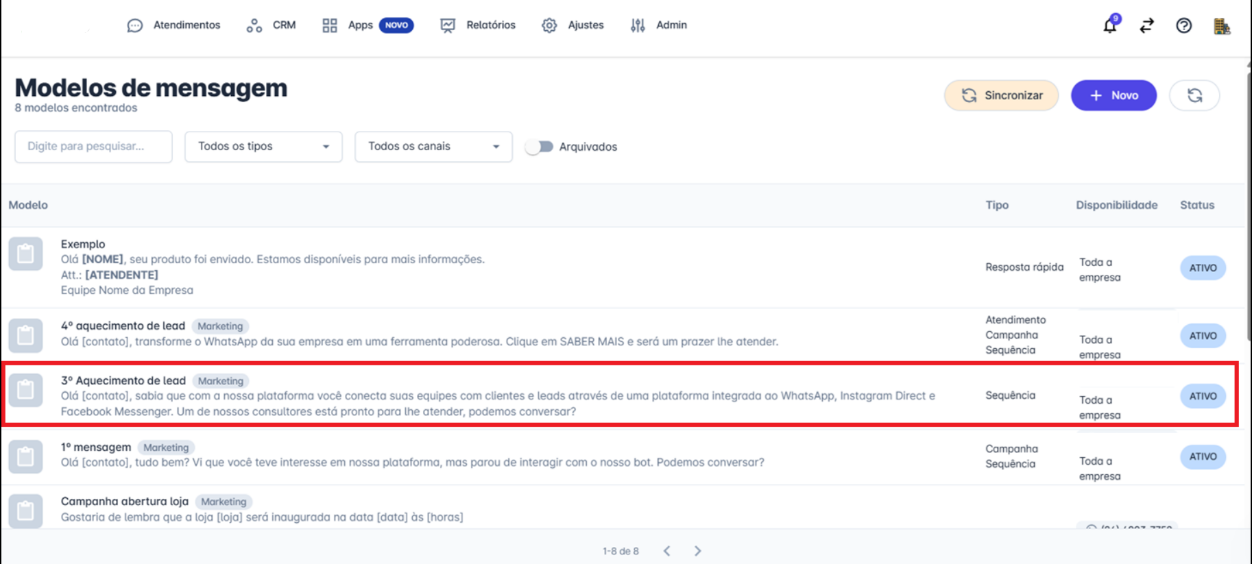 Apenas Administradores podem editar modelos de mensagem do tipo Atendimento, Campanha e Sequência.