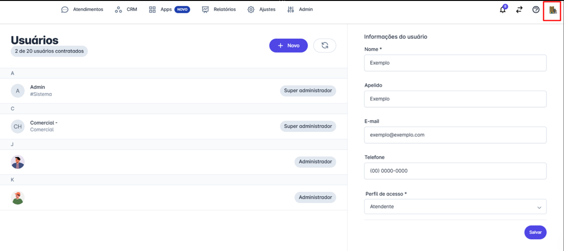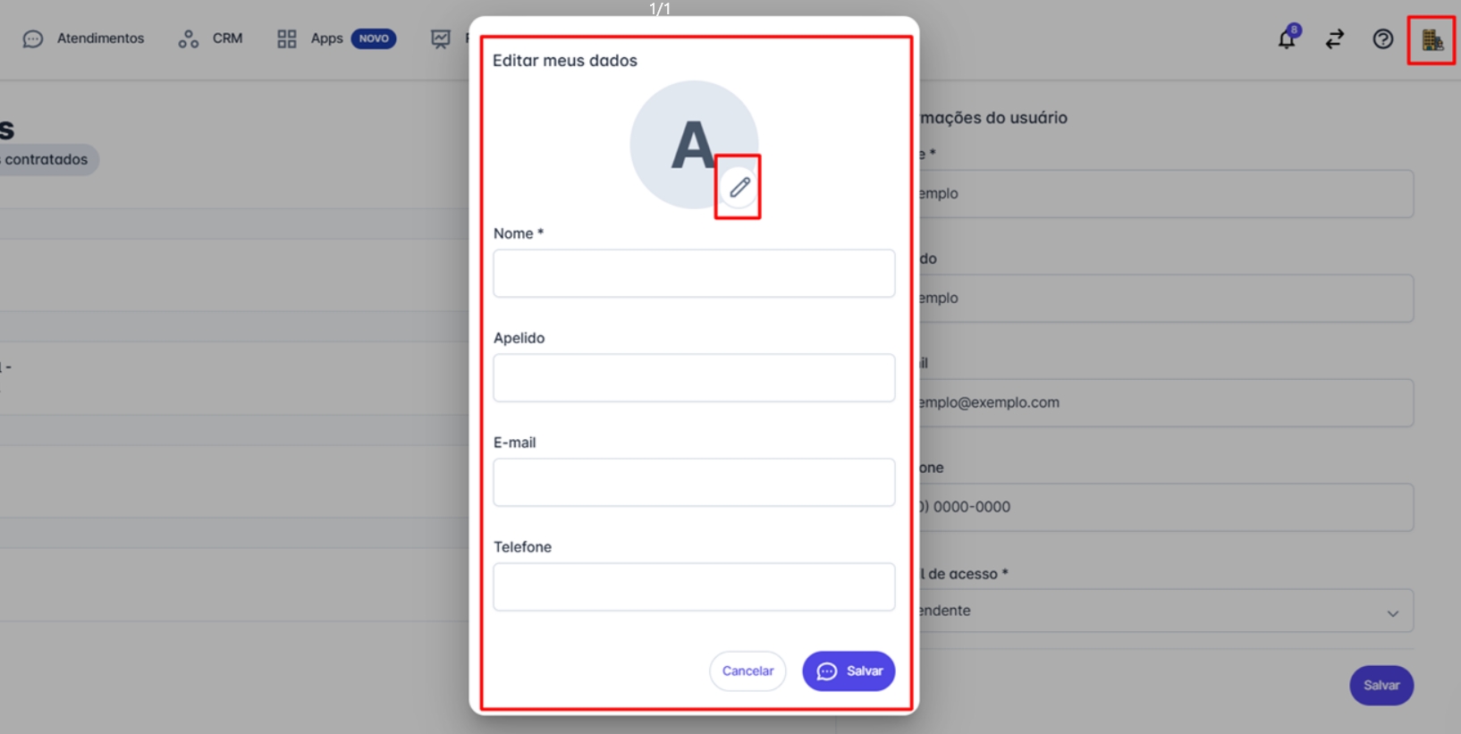Clique na logo da empresa no canto superior da tela para abrir as informações do usuário.