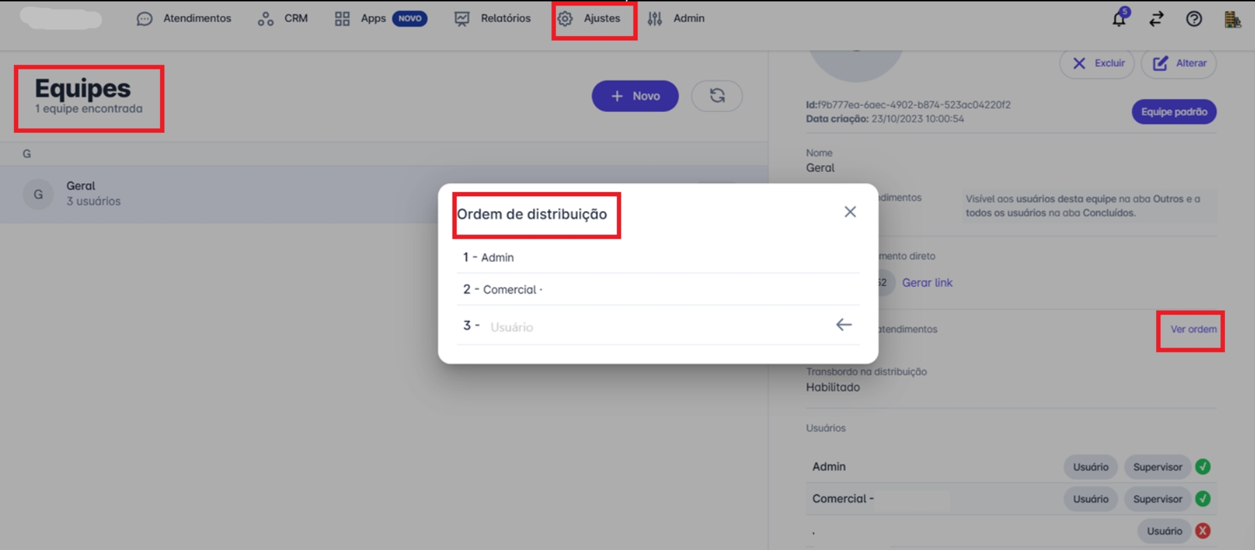 Passo 4: Em Ajustes ⟶ Equipes é possível visualizar a ordem que os atendimentos são distribuídos e uma seta estará no próximo atendente que receberá o atendimento.