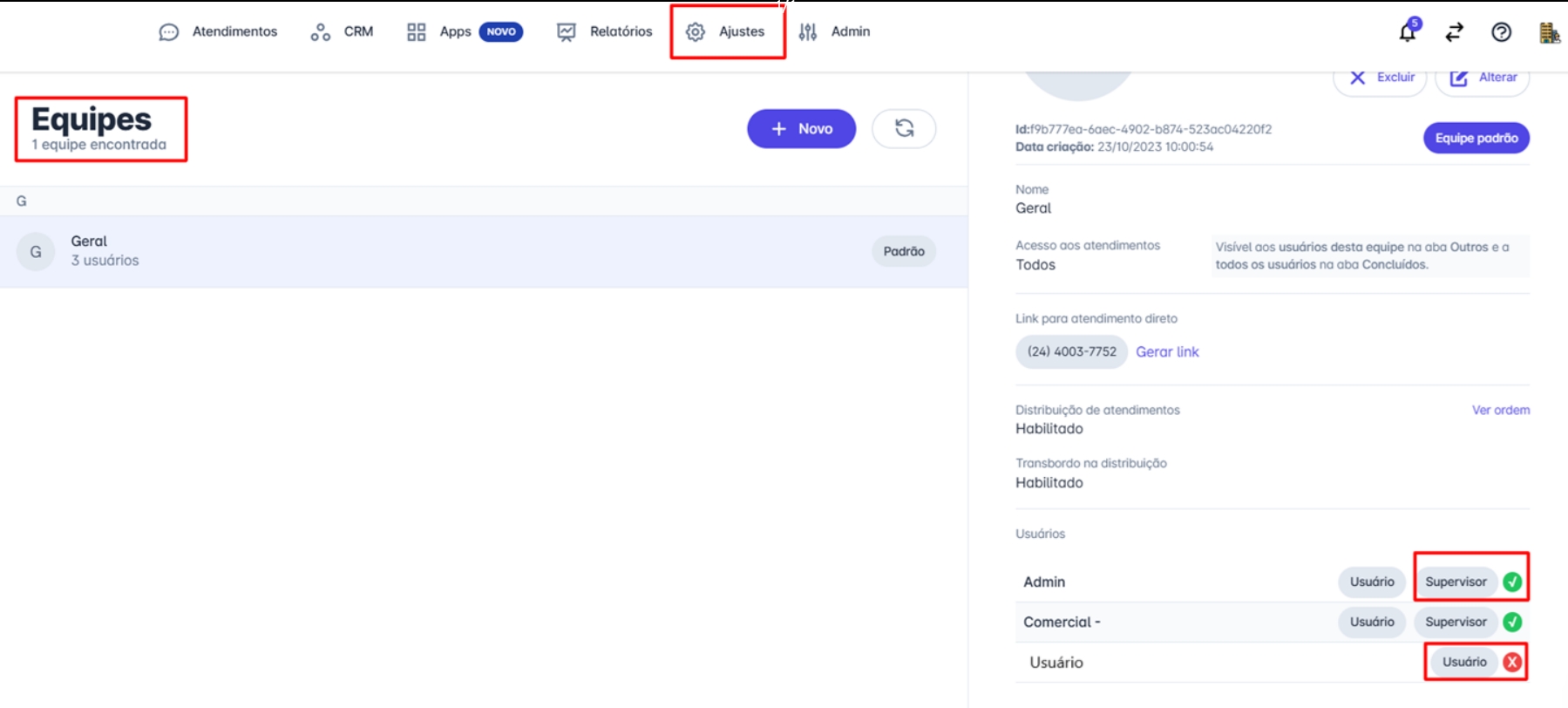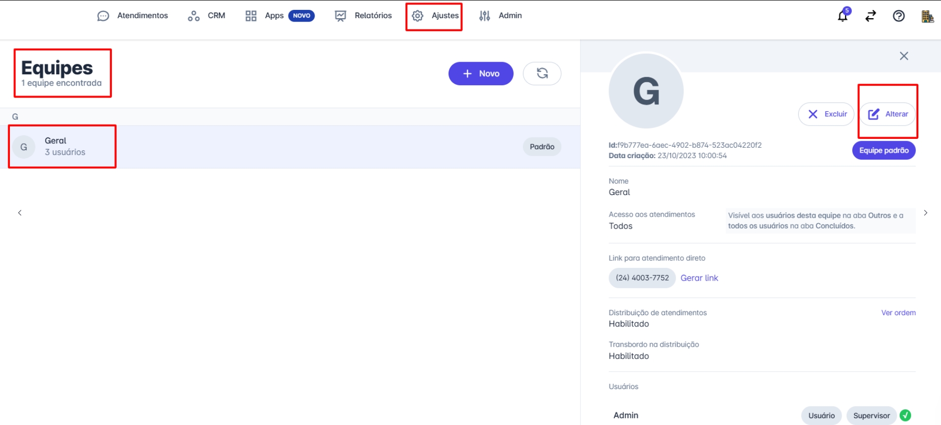 Passo 5: É possível configurar as informações da distribuição de atendimento clicando em: Ajustes ⟶ Equipes ⟶ Selecione a equipe ⟶ Alterar