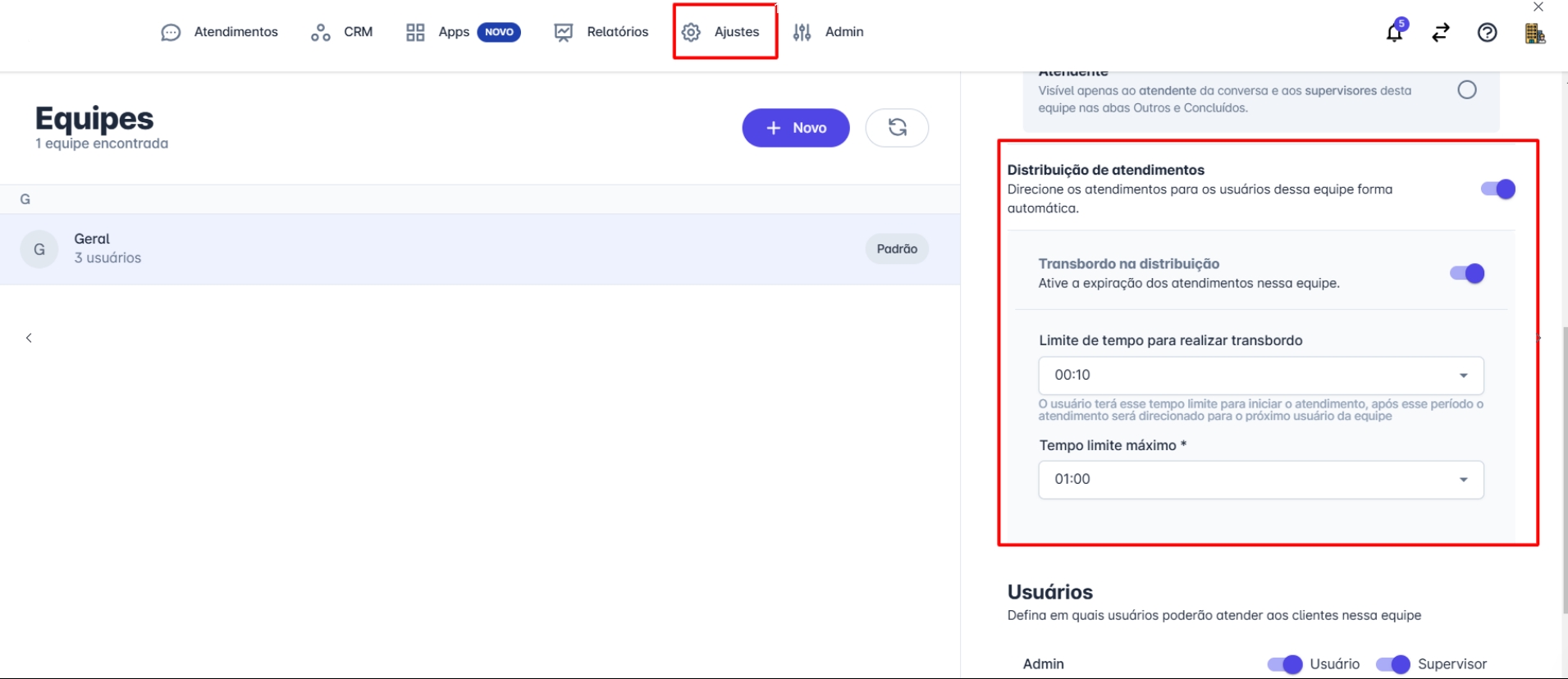 Passo 6: Se abrirá a janela de ajustes, é possível desabilitar/ habilitar a função de distribuição de atendimentos e ativar a função de transbordo na distribuição, que determina um tempo de expiração dos atendimentos na equipe. O limite de tempo é entre 10 minutos e 1 hora.