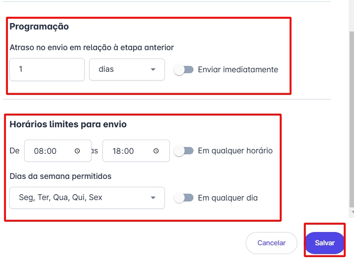 Programação: Selecione o intervalo de tempo, em relação ao último envio, para que a próxima mensagem seja enviada.