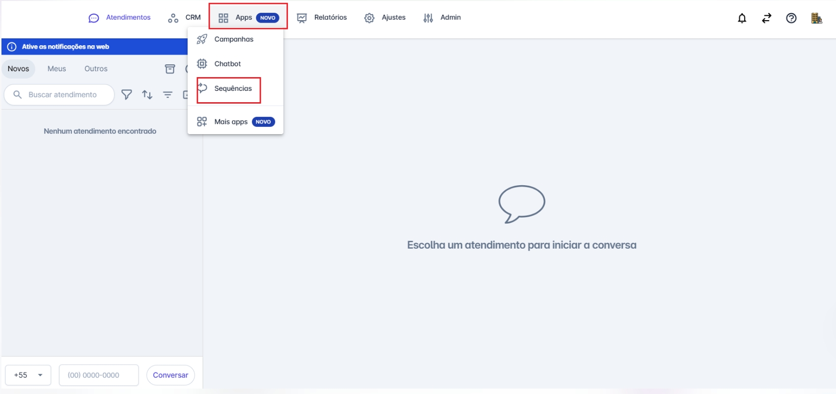 Passo 1: Na aba "Apps", selecione a opção "Sequências".