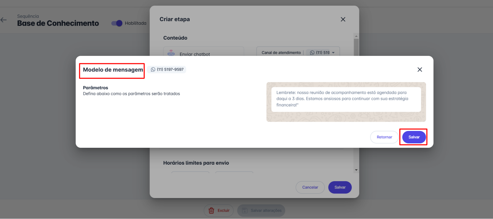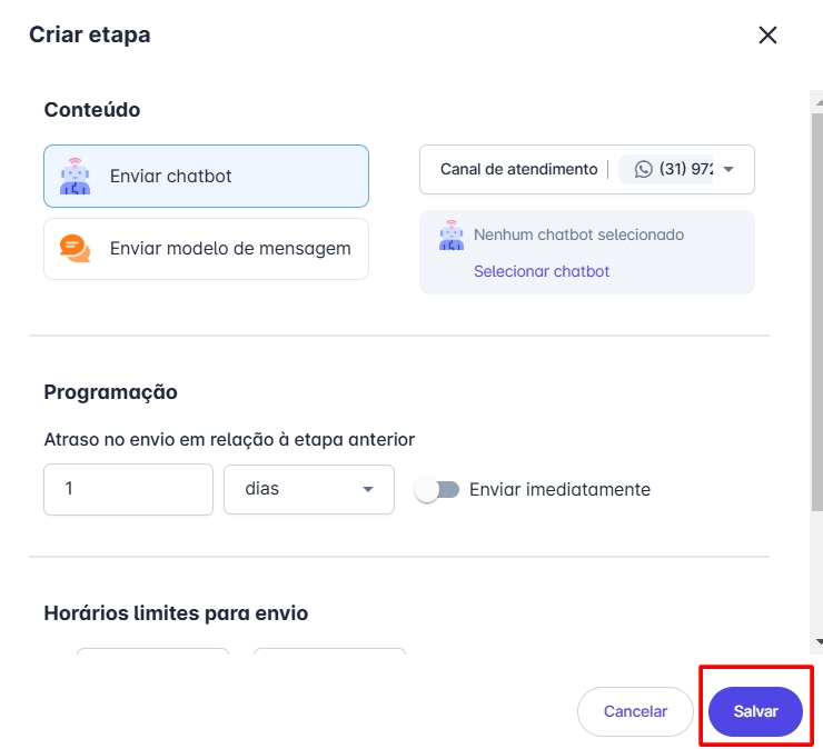 Passo 5: Uma janela será aberta para configurar uma etapa da sequência. O primeiro passo é selecionar o canal que será utilizado. Em seguida, decida se deseja enviar um chatbot ou um modelo de mensagem e selecione a opção desejada. Neste exemplo, será utilizado um modelo de mensagem.