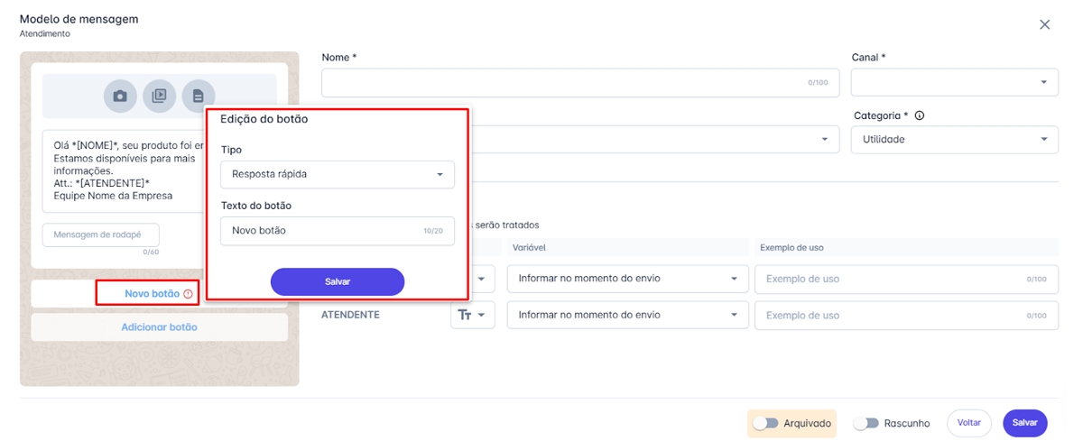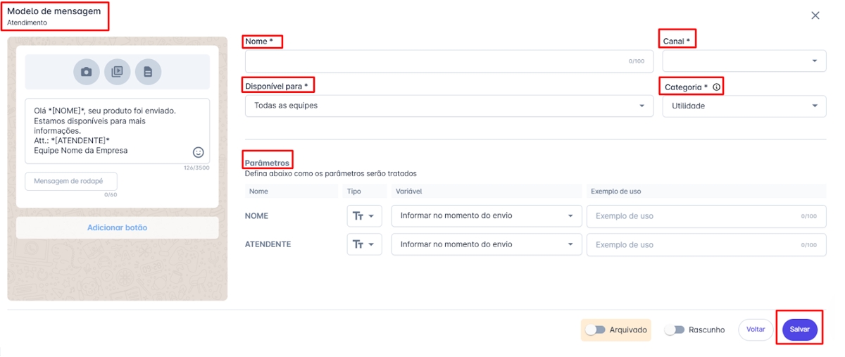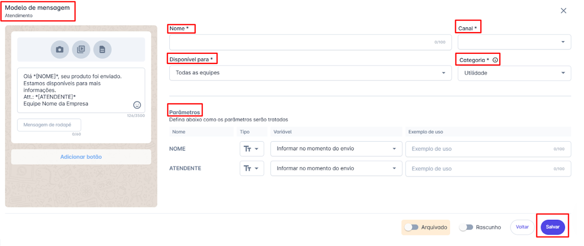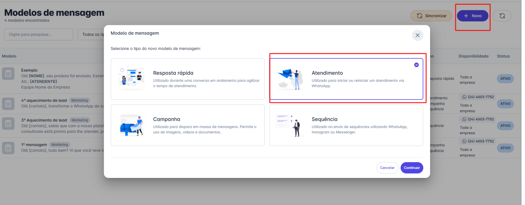 Somente os usuários com perfil de Administrador podem cadastrar modelos de mensagens do tipo Atendimento, Campanha e Sequência.