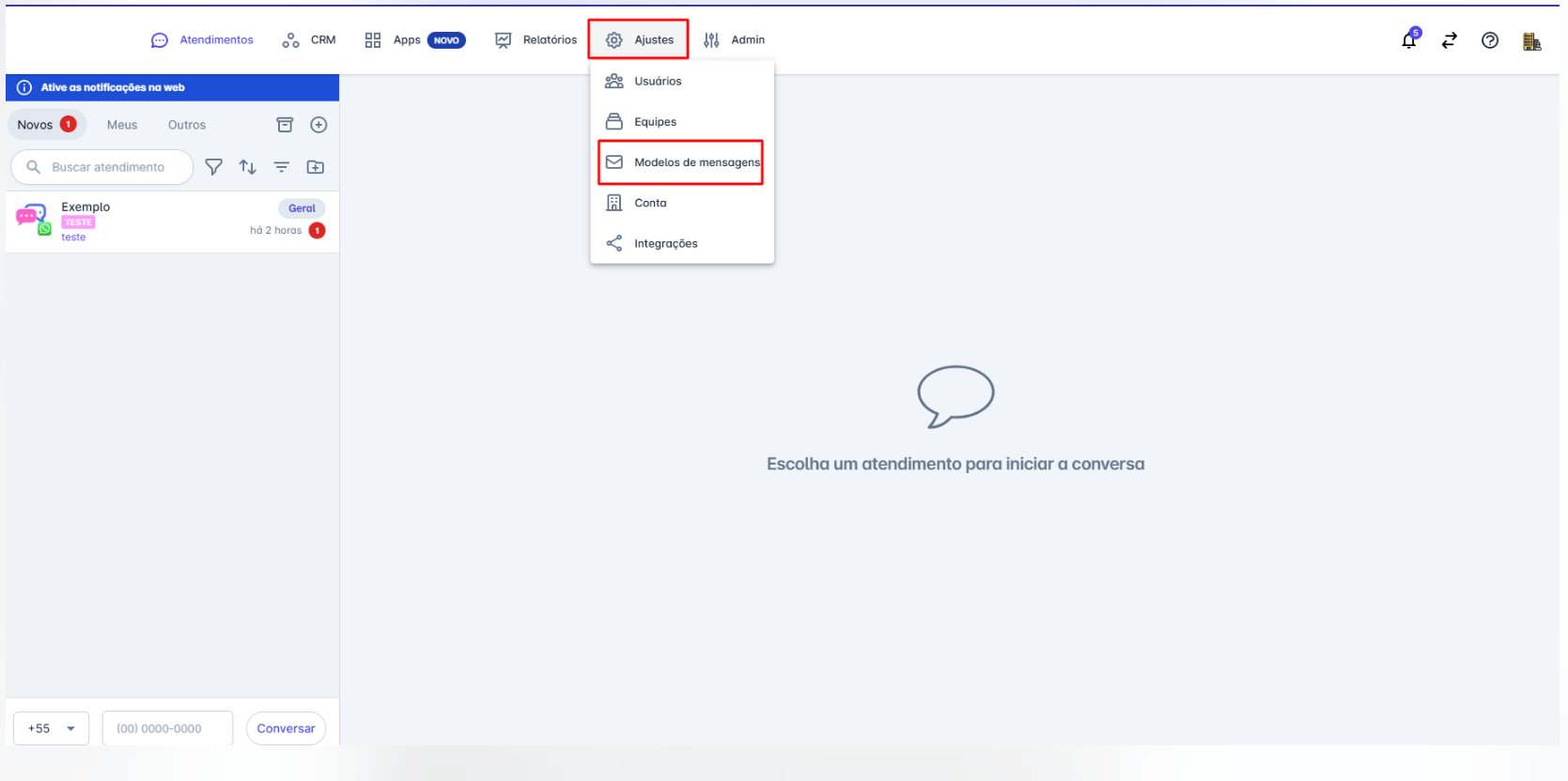 Passo 1: Na tela inicial da plataforma, clique na opção “Ajustes”, o menu de opções se abrirá, clique em Modelos de Mensagens.