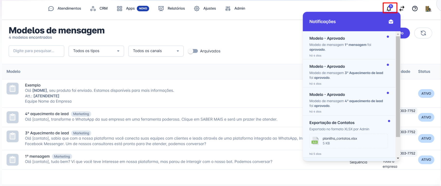 O status dos modelos de mensagens são enviados na barra de notificações da plataforma, conforme na imagem abaixo.