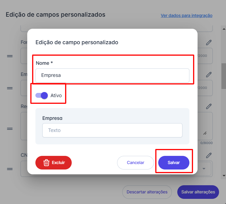 ao lado do campo que deseja modificar. Uma nova aba se abrirá; após fazer as edições necessárias, clique em 'Salvar'. Se preferir, também é possível excluir o campo personalizado.