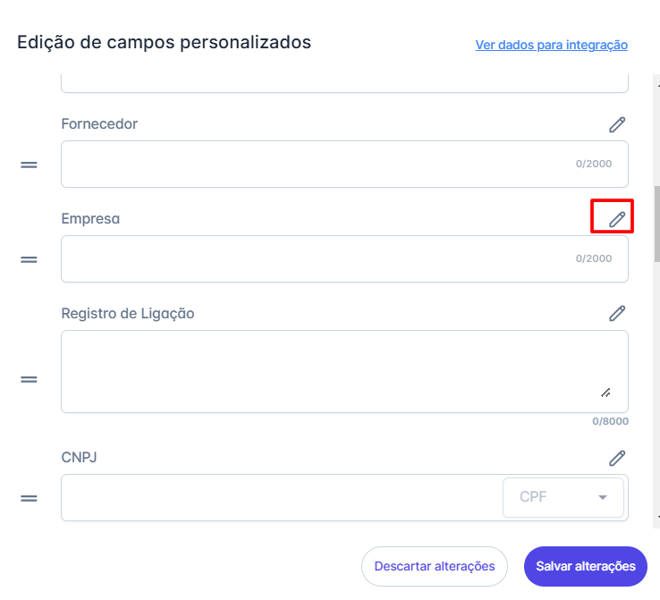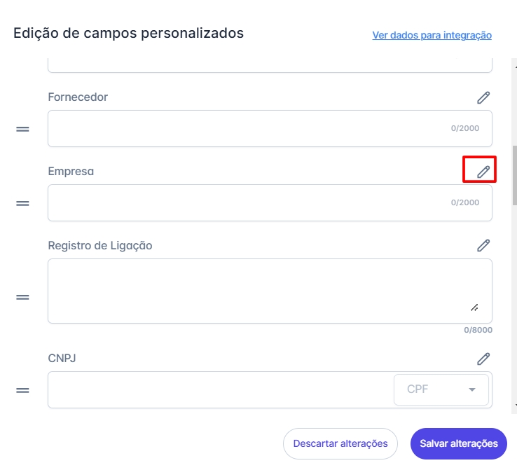 Passo 5: Para editar um campo personalizado, clique no ícone