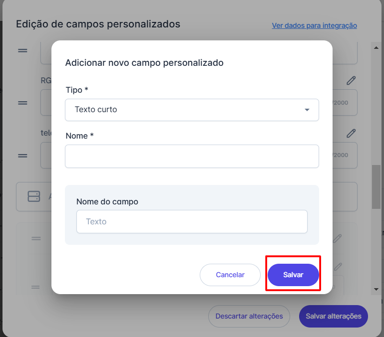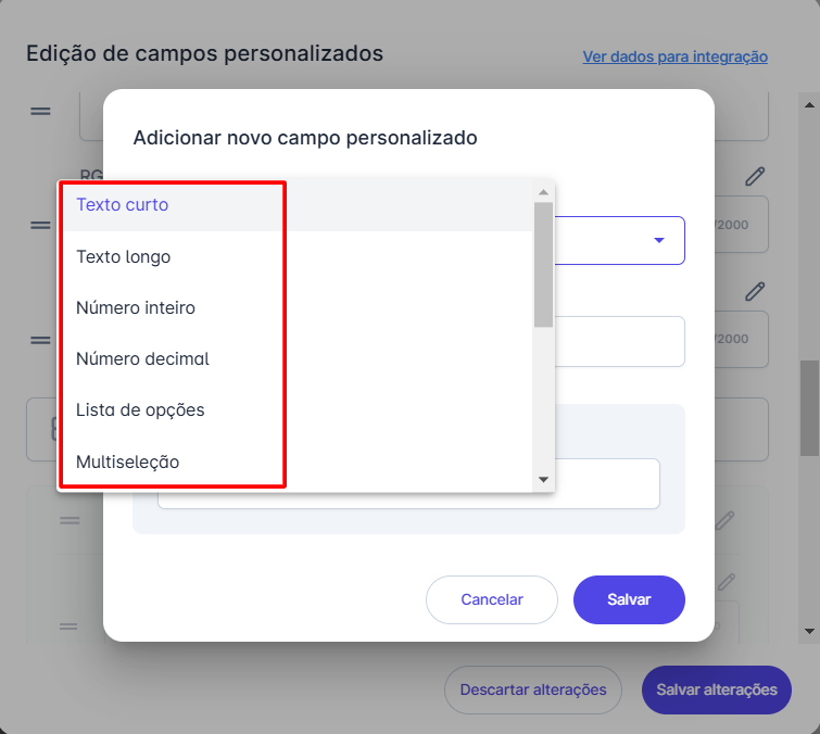 Passo 4: Para adicionar um novo campo, preencha a aba que se abrirá e escolha o tipo de informação que esse campo deverá conter: Texto curto, Texto longo, Número inteiro, Número decimal, Lista de opções ou Multiseleção. Em seguida, escolha um nome para o campo personalizado e clique em Salvar.