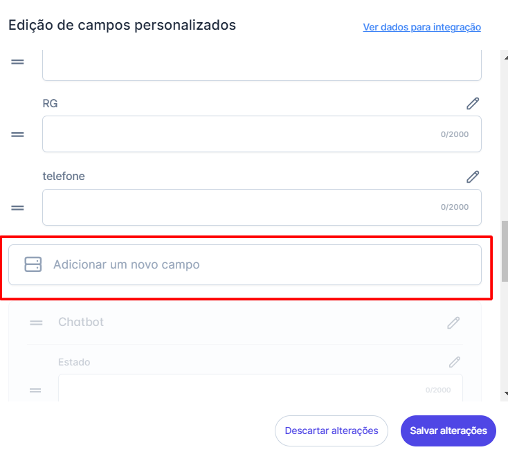 Ao criar ou excluir um campo personalizado, a ação terá efeito em todos os demais contatos da plataforma.