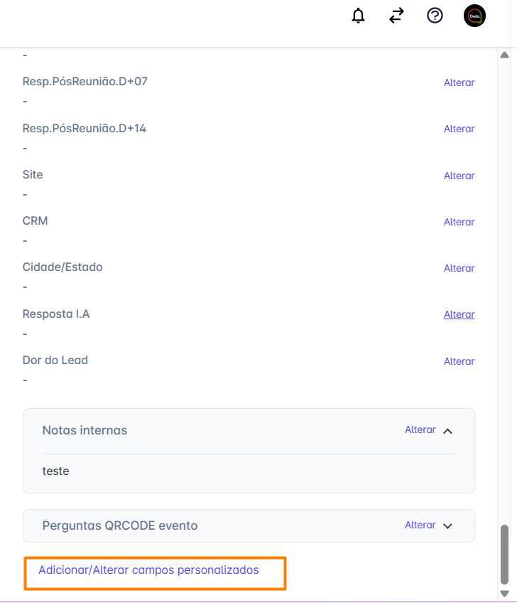 Passo 2: Selecione um contato para abrir a janela com as informações relacionadas. A plataforma apresenta campos pré-definidos, como Nome, Telefone, E-mail, Instagram, Etiquetas, Carteirização, Sequências e Notas Internas. Contudo, você pode adicionar campos personalizados: role até o final da página e clique em Adicionar/Alterar Campos Personalizados.