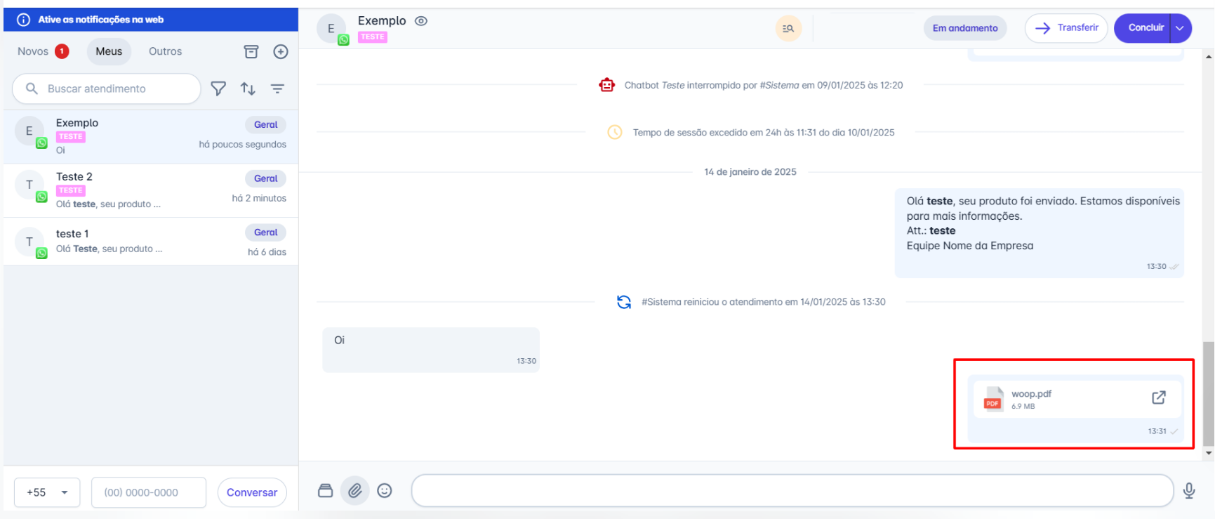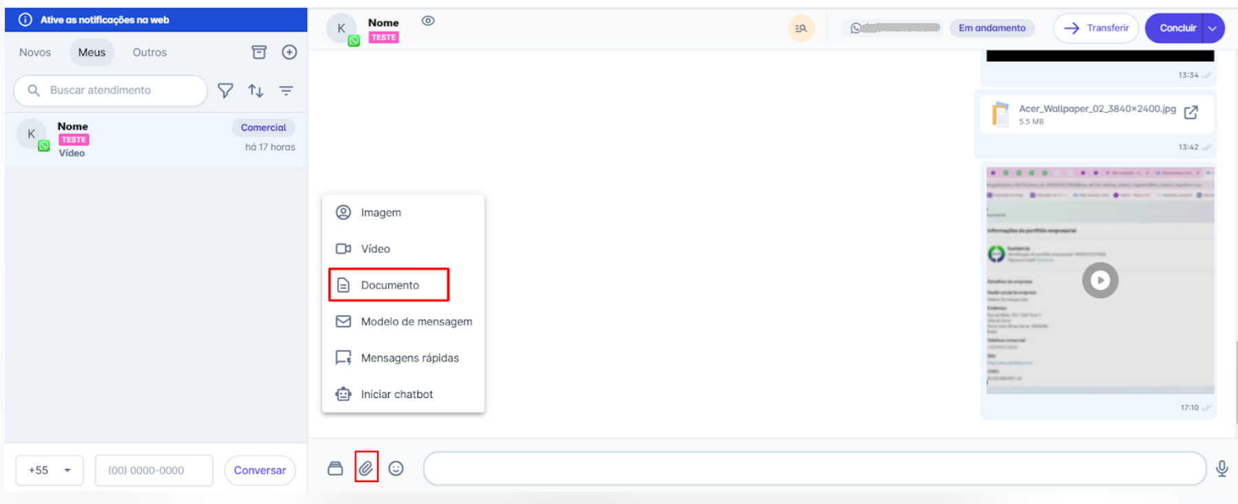 Passo 1: Na tela inicial, acesse o menu "Atendimentos". Selecione o contato para o qual deseja enviar um documento, para abrir a janela de conversa. Em seguida, clique no ícone