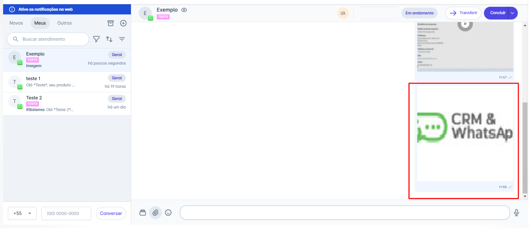 **Passo 2**: Após clicar na opção **"Imagem"**, a pasta do seu computador será aberta para que você possa escolher o arquivo que deseja enviar. Selecione a(s) **imagem(s)** e clique em **"Enviar"**. Após a **imagem** ser enviada, ela estará disponível para **visualização** ou **download** pelo contato.