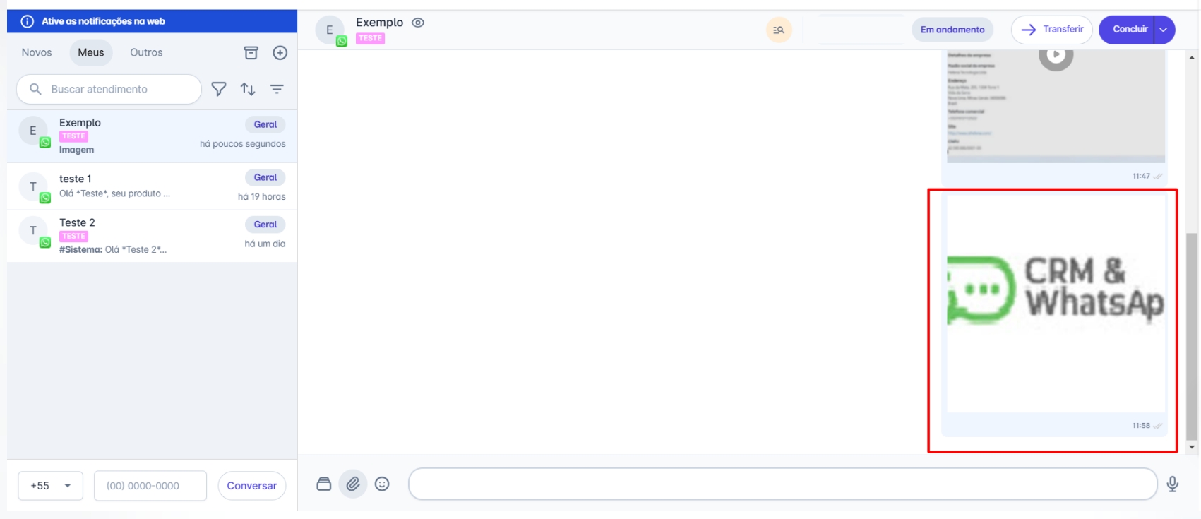 Passo 2: Após clicar na opção "Imagem", a pasta do seu computador será aberta para que você possa escolher o arquivo que deseja enviar. Selecione a(s) imagem(s) e clique em "Enviar". Após a imagem ser enviada, ela estará disponível para visualização ou download pelo contato.