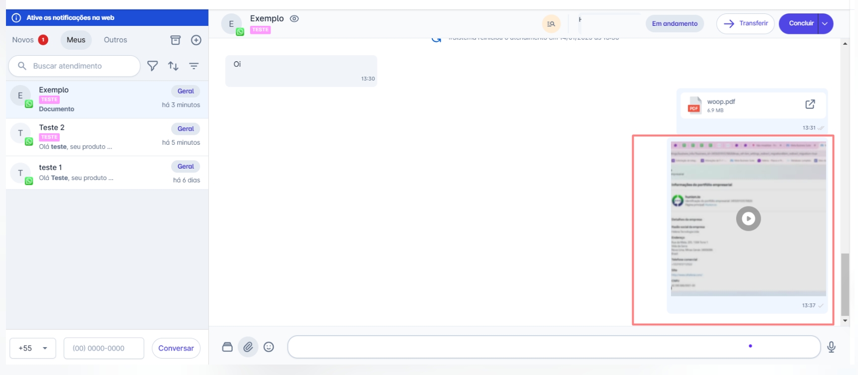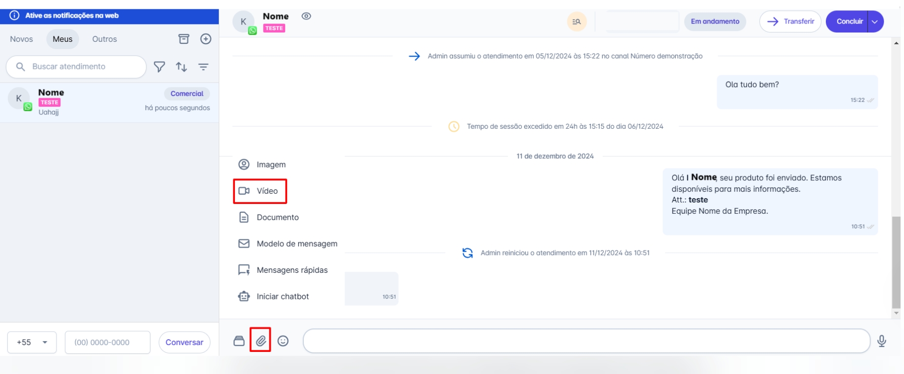 Passo 1: Na tela inicial, acesse o menu "Atendimentos". Selecione o contato para o qual deseja enviar o vídeo, para abrir a janela de conversa. Em seguida, clique no ícone
