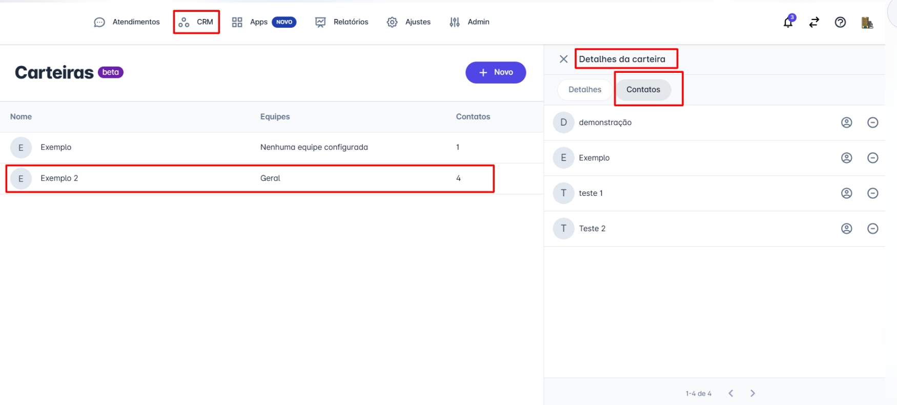 Passo 4: Para confirmar se o contato foi inserido na carteirização, basta clicar no menu principal "CRM" e, em seguida, clicar em "Carteiras". A tela exibirá as carteiras criadas.