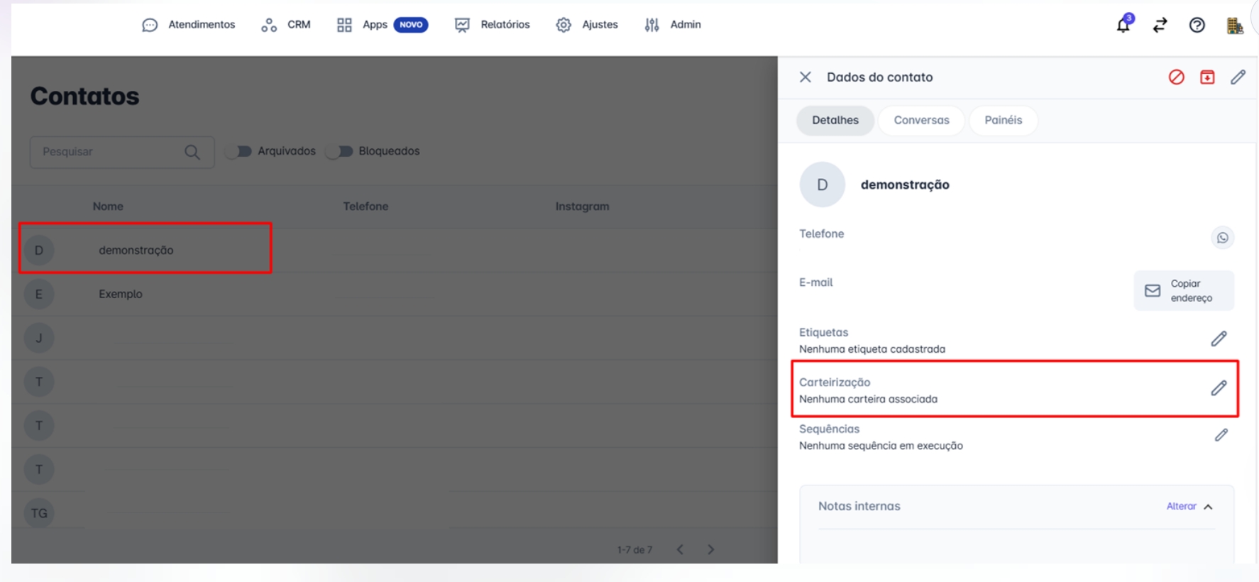 A inclusão e exclusão de contatos em uma carteira também pode ser feita diretamente nos detalhes do contato, inclusive durante um atendimento.