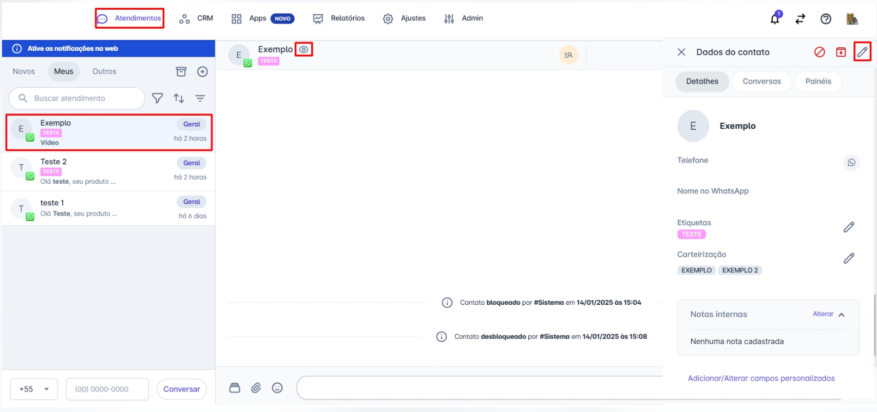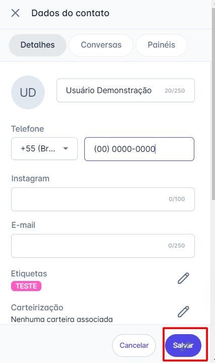 Passo 3: Após clicar no ícone de edição, os campos do contato serão habilitados para edição. Realize as alterações desejadas e, ao finalizar, clique em "Salvar" para confirmar as mudanças.