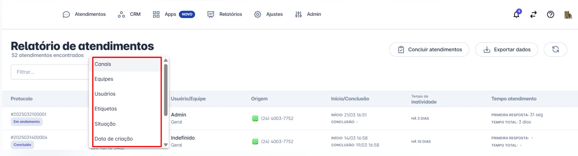 Passo 2 : Selecione os atendimentos desejados : Utilize os filtros disponíveis para encontrar os atendimentos que deseja finalizar.