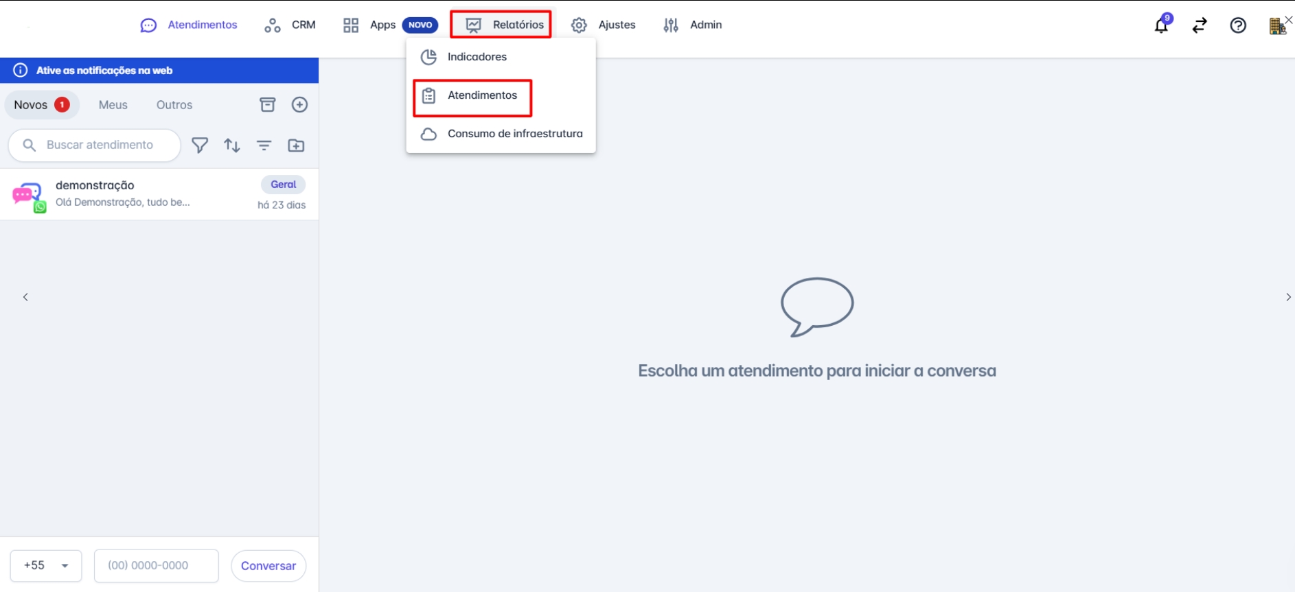 Passo 1: No menu principal clique em “Relatórios” e em seguida "Atendimentos”.